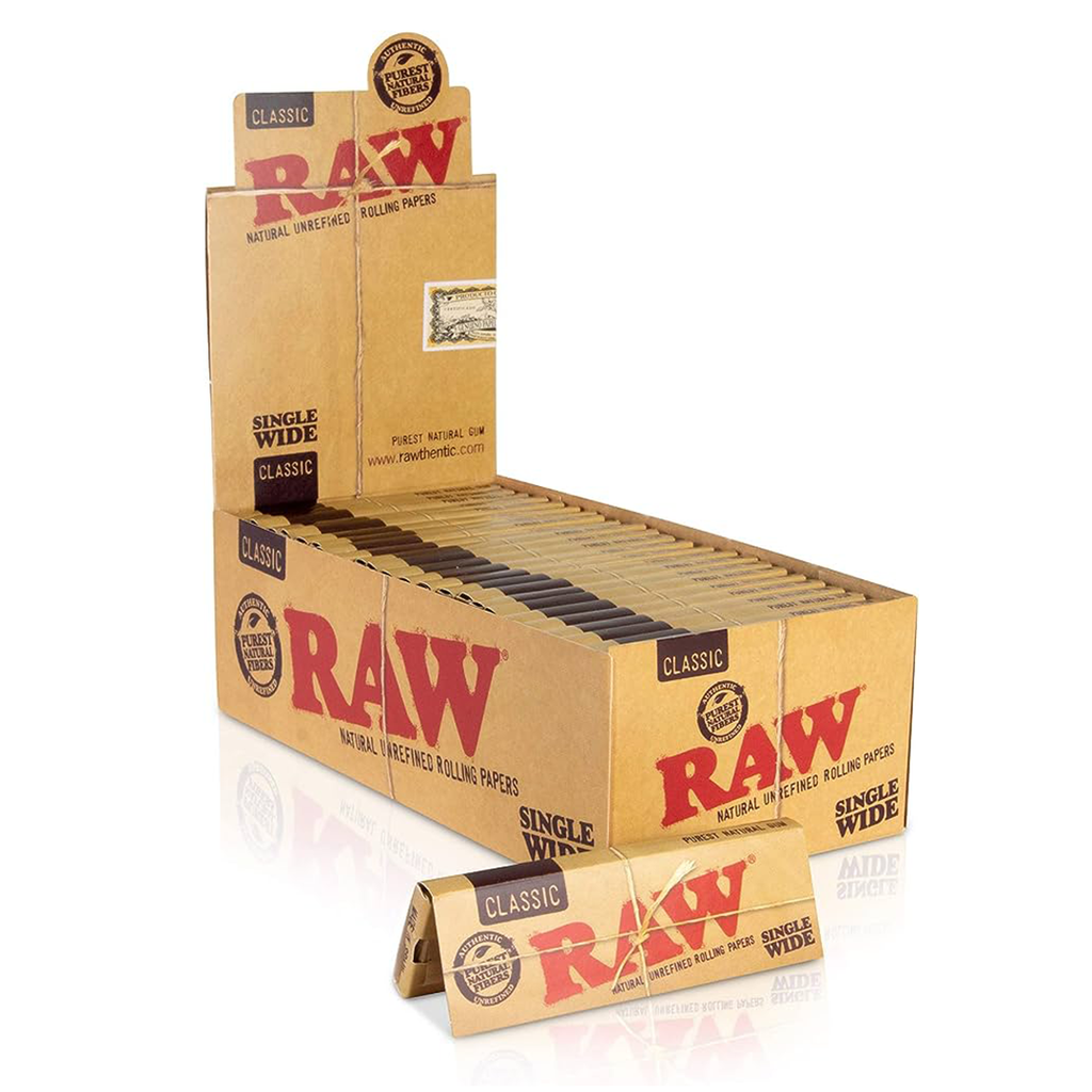 Papel de fumar Raw Single Wide Classic 70mm, contiene cincuenta hojas por librito de papel cien por ciento libre de cloro y sin blanquear, 100% natural, lo que da al papel ese color cobrizo claro natural.